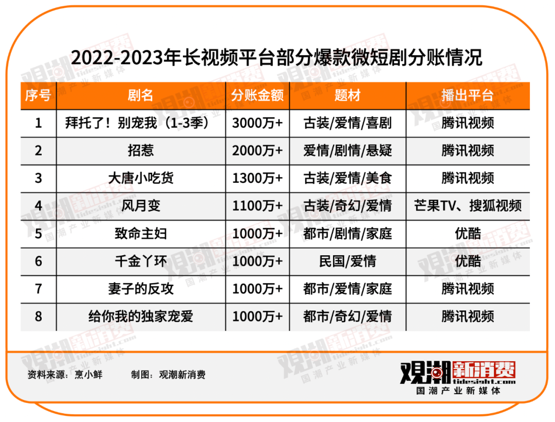 从微短剧的分账情况来看,据相关机构及媒体统计,2020年到2022年爱优腾三大平台公布的微短剧分账金额超过1.5亿,2023年上半年分账金额超过6000万。其中,前三年主要参与分账的微短剧有十几部,2023年上半年主要参与分账的十余部。