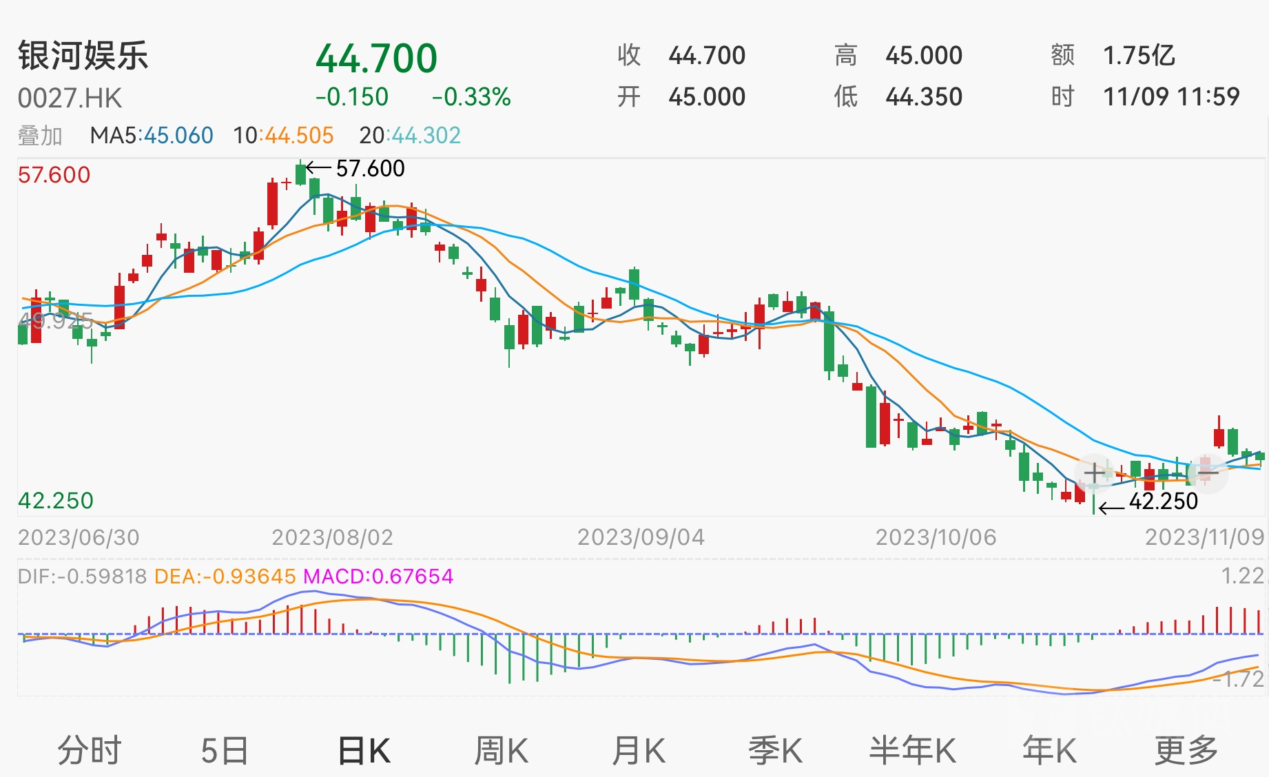 虽然公司在最新披露的三季度业绩报告中表现不俗,但二级市场方面的反应却不算理想。截至11月9日早盘休市,银河娱乐股价报44.7港元,微跌0.33%,成交额为1.75亿港元,当前公司总市值约1954.99亿港元。