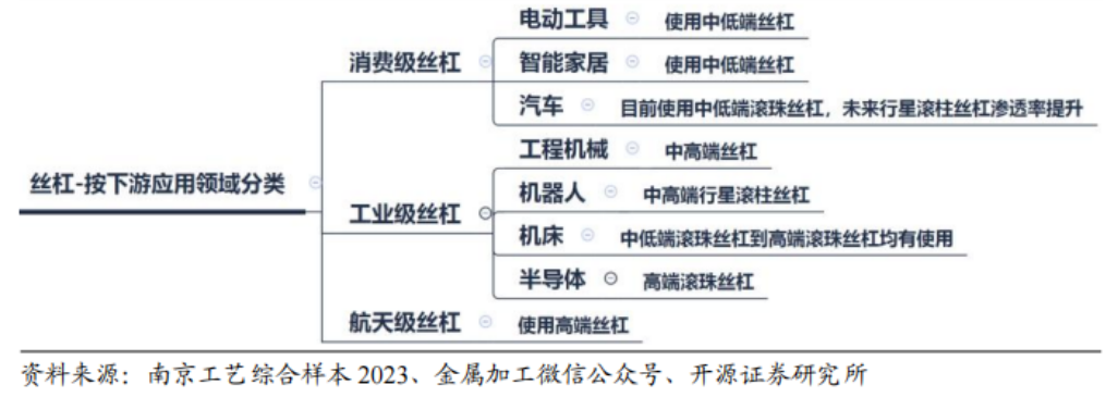 丝杠的主要功能是将旋转运动转化成线性运动,或者将扭矩转换成轴向反复作用力。按照结构不同,分为行星滚柱丝杠、滚珠丝杠和梯形丝杠。而按照下游应用则可以分为消费级、工业级、航天级。对应着低中高端产品。