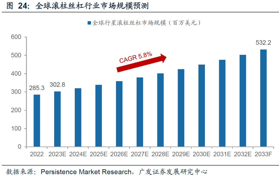 据Persistence Market Research数据显示,2023年全球滚柱丝杠市场规模预计为3亿美元,约21亿人民币;即使十年之后,研究机构预测总规模也仅达到5.3亿美元。