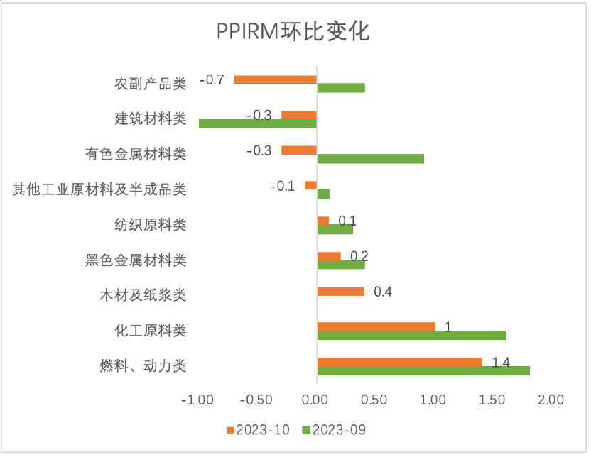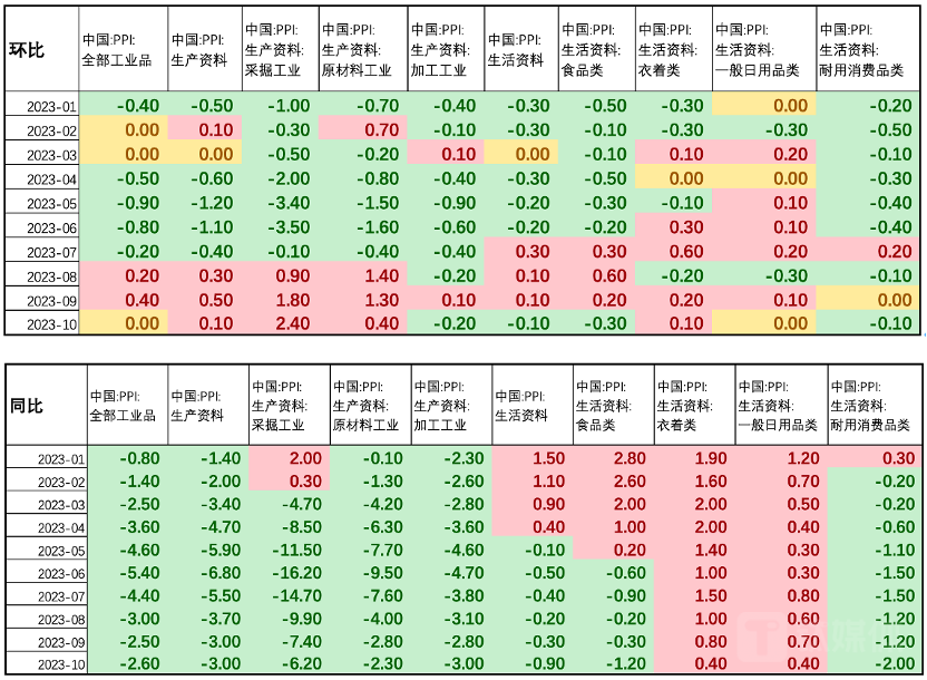 10月PPI环比为0,同比下降2.6%。从结构看,上游生产资料价格有所恢复,下游生活资料价格有所下滑。10月生产资料价格环比上涨0.1%,涨幅下降0.4个百分点,同比下降3.0%,与上月持平;采掘类环比上涨2.4%,涨幅较上月扩大0.8个百分点,同比下降6.2%;原材料工业环比上涨0.4%,涨幅下降0.9个百分点,同比下降2.3%;加工工业环比下降0.2%,同比下降3.0%。10月生活资料出厂价格环比下降0.1%,环比由正转负,同比下降0.9%;食品环比下降0.3%,同比下降1.2%,和CPI中一致;一般日用品环比持平,同比上涨0.4%;衣着环比上涨0.1%,同比上涨0.4%;耐用消费品环比下降0.1%,同比下降2.0%。
