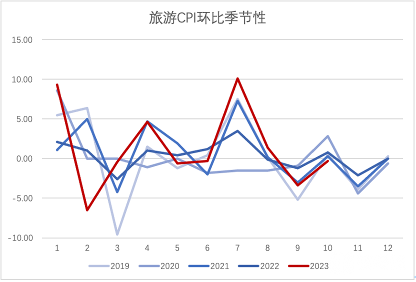 旅游拖累服务业价格。10月服务价格环比下降0.1%,同比上涨1.2%,其中旅游环比下降0.3%,飞机票和旅游价格分别下降7.7%和0.3%。国庆长假后,人们多数不会再选择在后三周进行休假旅游,因此出行需求回落,旅游消费由旺转淡。从季节性图可看出,尽管出行国庆假期中人数和旅行收入较2019年小增,但10月份旅游CPI环比表现低于季节性。其他服务表现整体平稳,家庭服务、通信服务、教育服务、医疗服务均环比为0,邮递服务环比下降0.1%,其他用品与服务环比上涨0.1%。