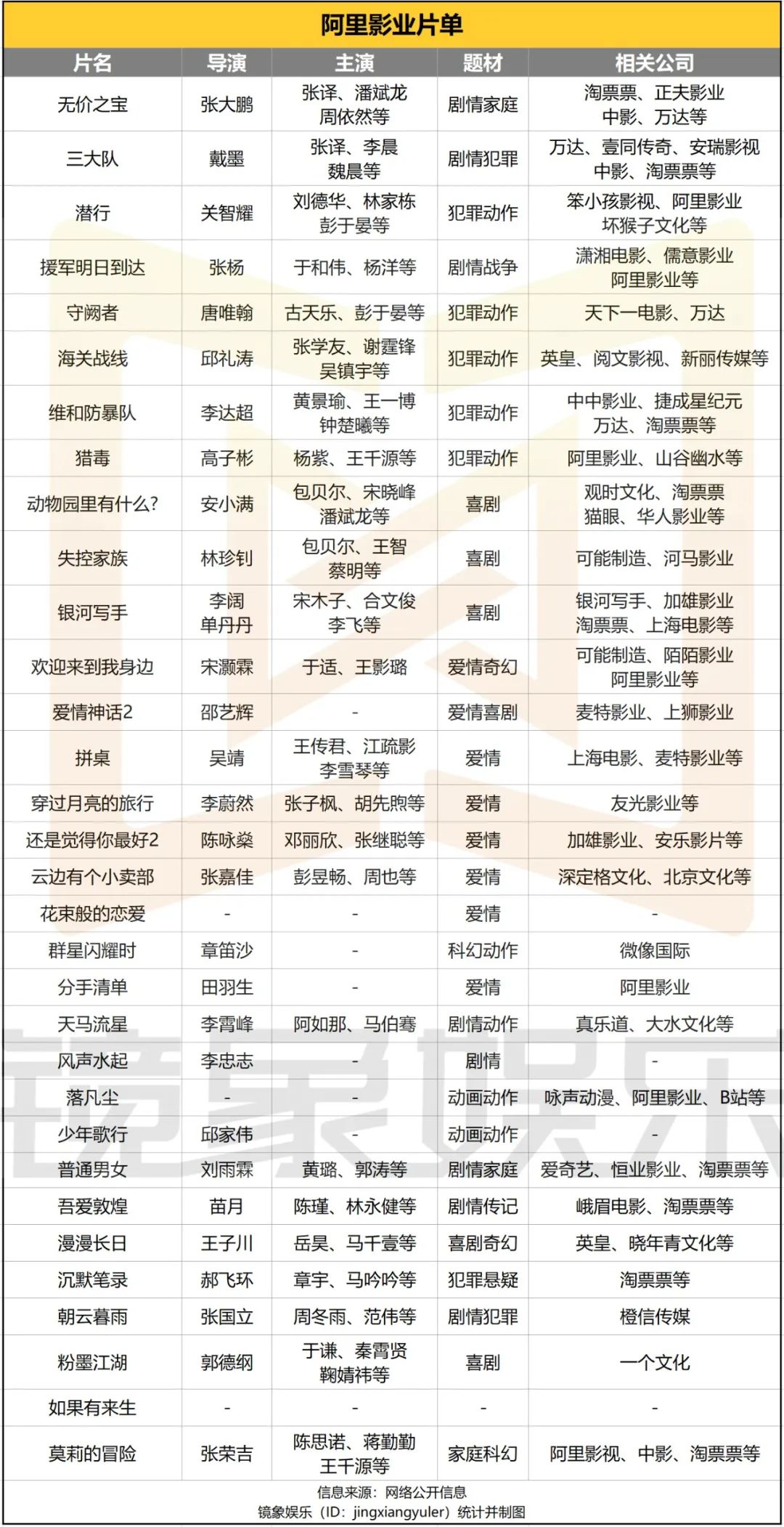 讨论之余,不难看出电影市场持续活跃。同时更值得关注的是,这些影片都出现在金鸡节期间,阿里影业与猫眼电影各自发布的岁末片单中。据镜象娱乐统计,两大影企累计发布超60部片单,内容覆盖到犯罪、动作、喜剧、爱情、科幻等多种题材,除了即将上映的《无价之宝》《我本是高山》之外,《一闪一闪亮星星》《年会不能停!》《三大队》《云边有个小卖部》等影片同样颇受关注。