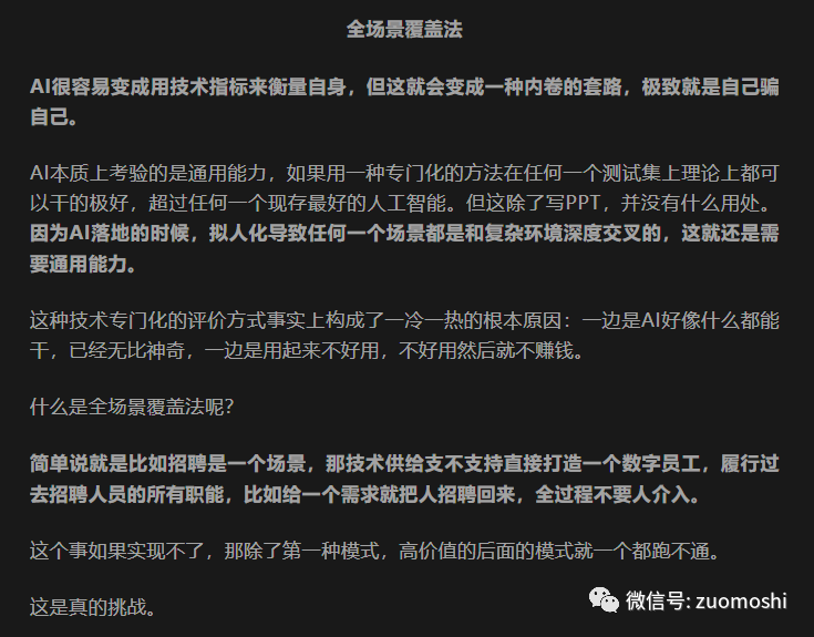 从深度来讲,在AI行业从业者/企业相当比例盈利之前,大模型再怎么惊艳,那它的深度也是不够的。而像在AI能赚到钱了么?里强调的,当这种智能通用性足以覆盖任何一个场景的各个方面,并且真正匹配一个人所能创造的价值时,那就注定会盈利,因为在智能上的成本总是低于雇佣对应人员的成本。