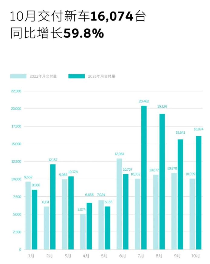 在官宣降价后,蔚来的销量迎来了一小波反弹,在7月份销量突破了2万辆。只可惜这一趋势未能延续下去,在随后的8月、9月、10月,蔚来汽车交付量分别为19329辆、15641辆、16074辆,再没有突破月销2万辆的成绩。