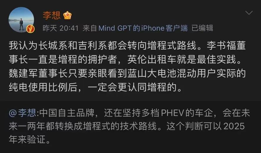 “中国自主品牌,还在坚持多档PHEV的车企,会在未来一两年都转换成增程式的技术路线。这个判断可以2025年来验证。”李想在微博上说。
