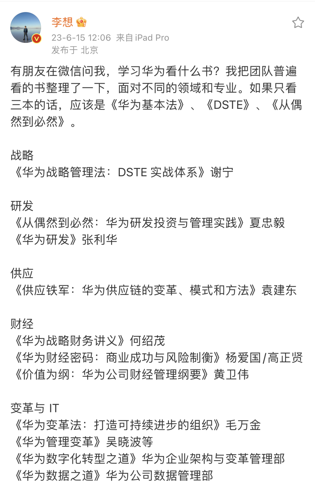 面对华为,一向怼天怼地的李想一直是“学生”姿态。今年6月,理想在微博上列出了自己学习华为的一长串书单;问界上市后,理想内部秋季战略会上,华为代替比亚迪,成为理想的头号对手。