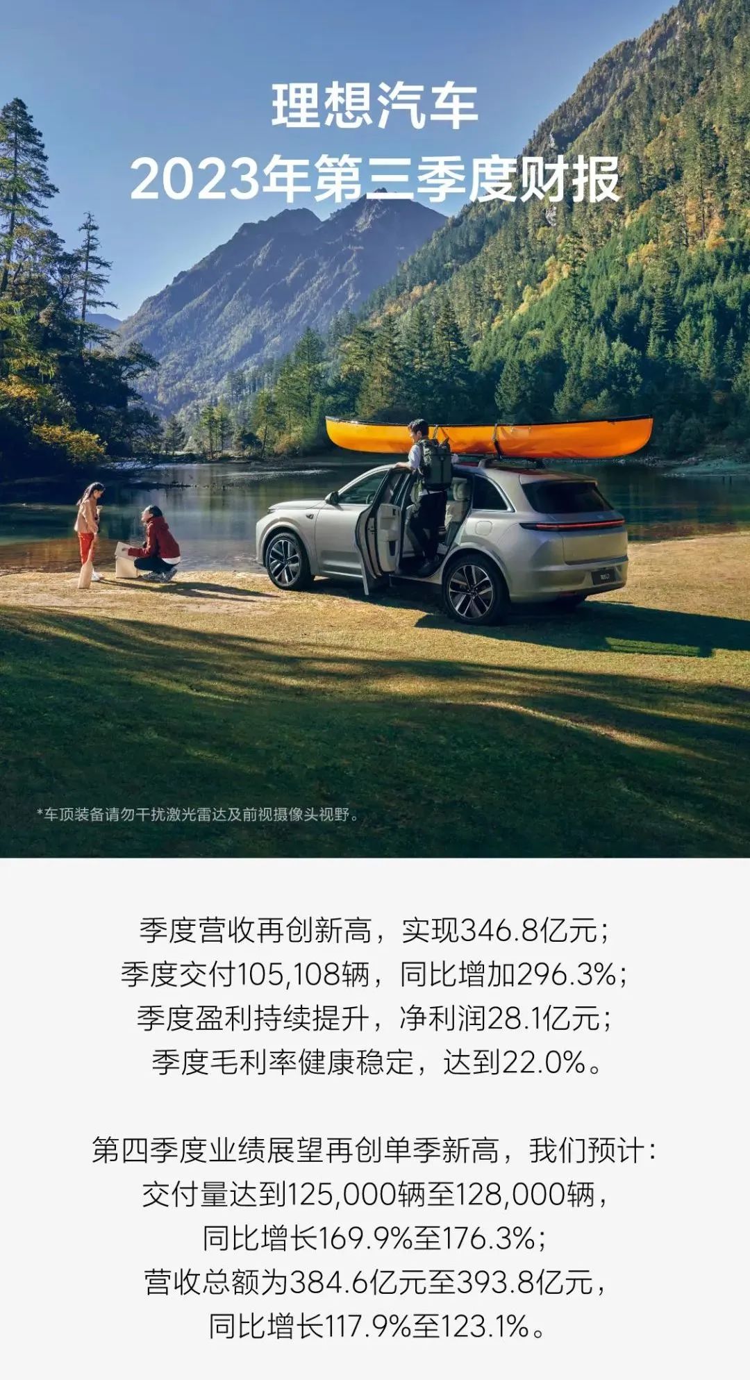 当下,理想可能是比亚迪以外活得最滋润的国内车企。11月9日,理想汽车公布2023年第三季度财报。三季度,理想营收346.8亿元,同比增长271.2%,创历史新高,同期经营利润和净利润分别为23.4亿元和28.1亿元,实现连续四个季度盈利。