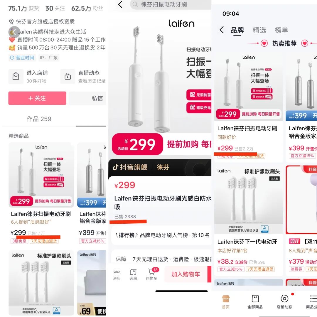 在抖音,徕芬的直播近乎贯穿全天,下注似乎确有成效。新熵在3个同时在线的直播间里观察到电动牙刷其累计销量分别为2.2万,2388,1.1万,销售量虽进入平缓区间,但增量依旧可观。