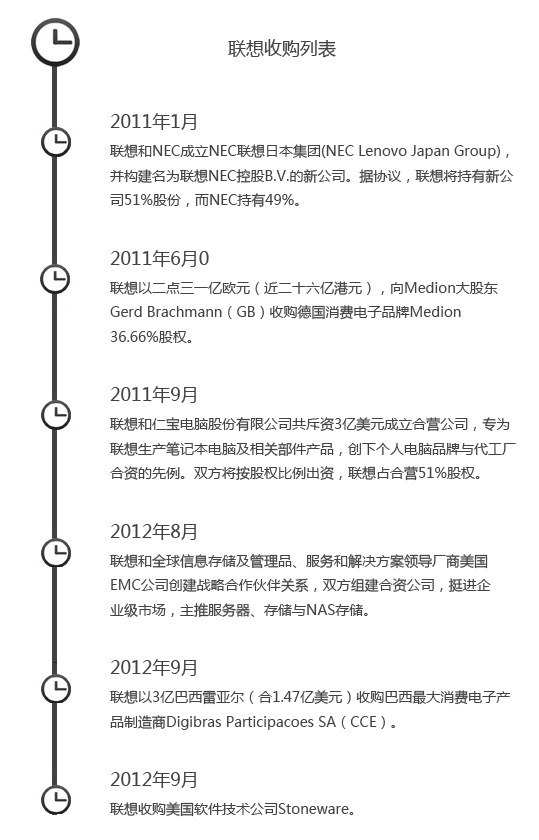 除了启用本地化人才以外,联想启动了更加激进收购战略来实现更加快速的成长。2011年开始,由于盈利改善,现金流充沛,联想进行的很多起收购。