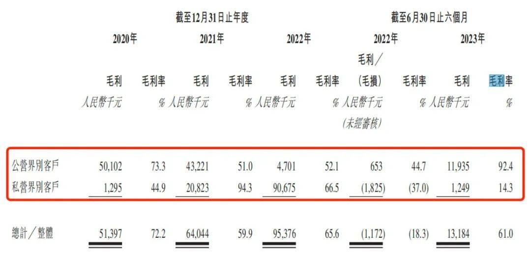 2020年-2022年,赛目科技向公营客户销售的毛利率分别为73.3%、51.0%、52.1%,2022年这一数据较2020年下滑了三十个百分点;公司向私营客户的销售毛利率分别为44.9%、94.3%、66.5%,也波动较大。