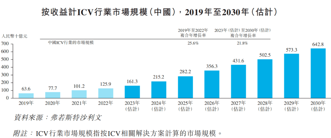 近年来,我国ICV市场规模不断扩大。据弗若斯特沙利文数据,2019年,我国ICV行业的市场规模约636亿元;2022年已增长至约1259亿元,复合年增长率约25.6%;预计2030年将增至6428亿元,自2023年起的复合年增长率约为21.8%