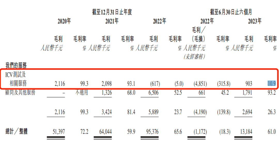 招股书显示,报告期内,公司的毛利率分别为72.2%、59.9%、65.6%、61%,也呈现出波动下滑的趋势。其中,ICV测试及相关服务的毛利率由2020年的99.3%下滑至2022年的-5.0%,2023年上半年虽然转正,但是只有10.9%。