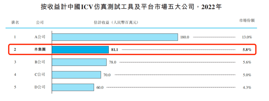 根据弗若斯特沙利文数据,2022年,中国ICV仿真测试工具及平台的市场规模达到14亿元。按收益计,前五大市场参与者贡献了整个市场份额的33.8%,赛目科技排名第二,并且是我国最大的ICV仿真测试工具及平台供应商。