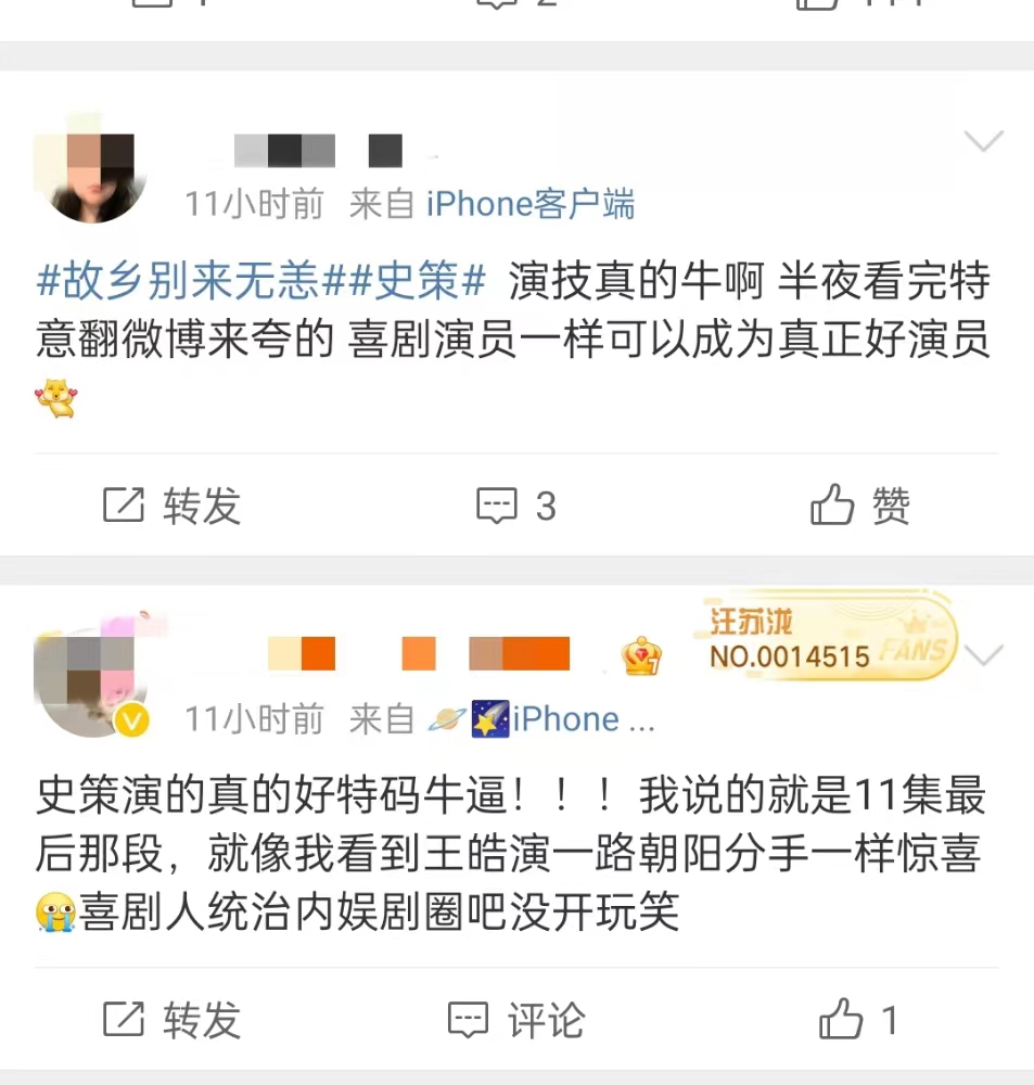 和《一年一度喜剧大赛》相似,史策的情感戏和哭戏在剧中都受到好评。从抓到男友出轨到发现冰箱里贴有男友叮嘱的字条,再到两人对峙分手的几场戏中,史策的处理情感细腻,爆发力强,容易引发共鸣。有网友评论史策的表演“喜剧人一样可以成为好演员”、“喜剧人统治内娱剧圈吧”“联想到王皓在《一路朝阳》中的分手戏”。