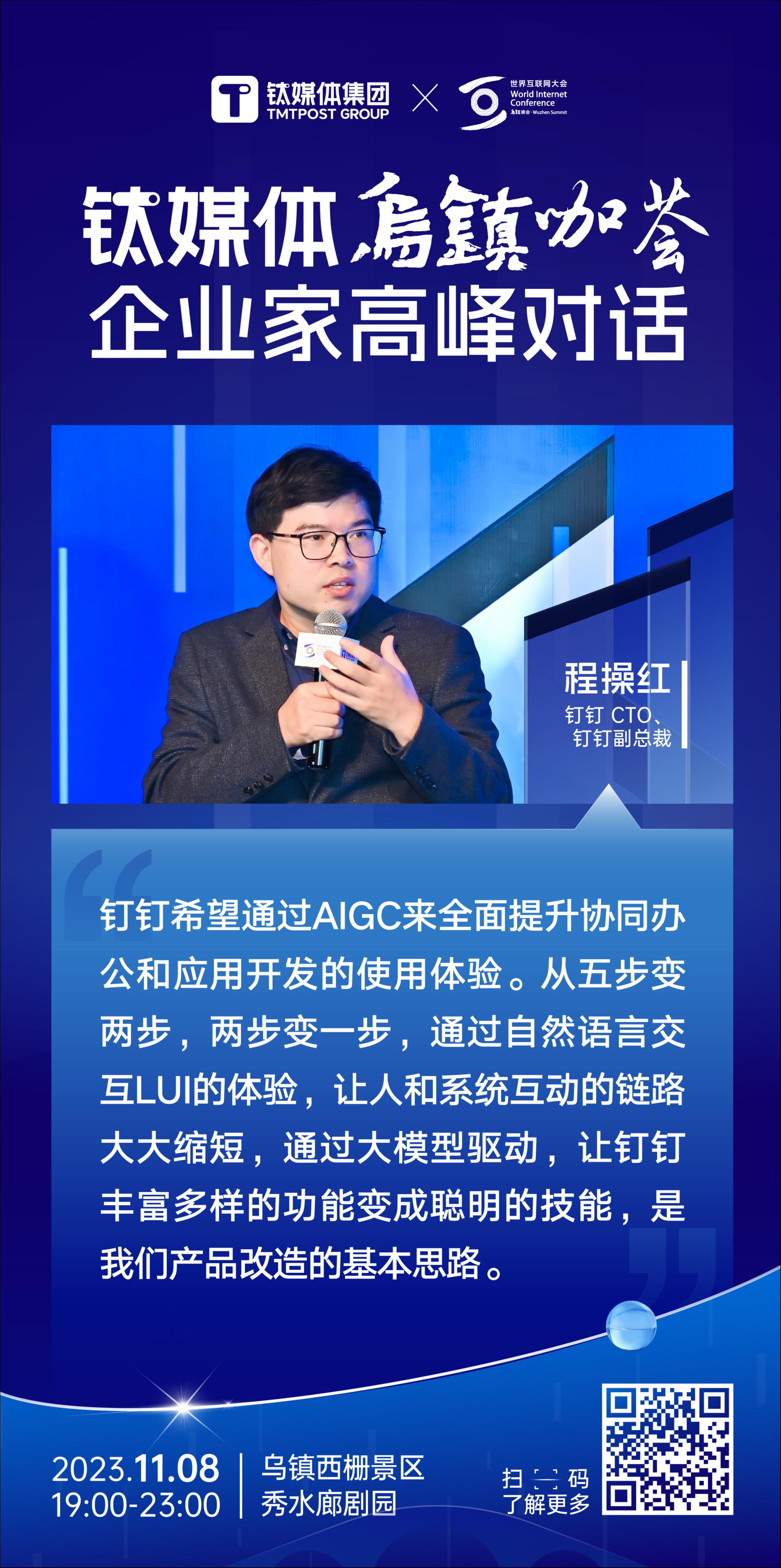 11月8日晚,乌镇咖荟一如既往地延续了轻松、自由的讨论氛围,钛媒体集团邀请了搜狐创始人、董事局主席兼首席执行官张朝阳、量子之歌集团联合创始人白柏,顺网科技CEO樊星,货拉拉CTO张浩,福瑞泰克智能系统有限公司董事长兼首席执行官张林,轻松集团执行副总裁马孝武,云天畅想创始人、董事长茅晓东,钉钉CTO、钉钉副总裁程操红,知乎创始人、CEO周源,印象笔记董事长兼CEO唐毅等嘉宾,漫谈AIGC、大模型生态、算力、数字经济等热点。