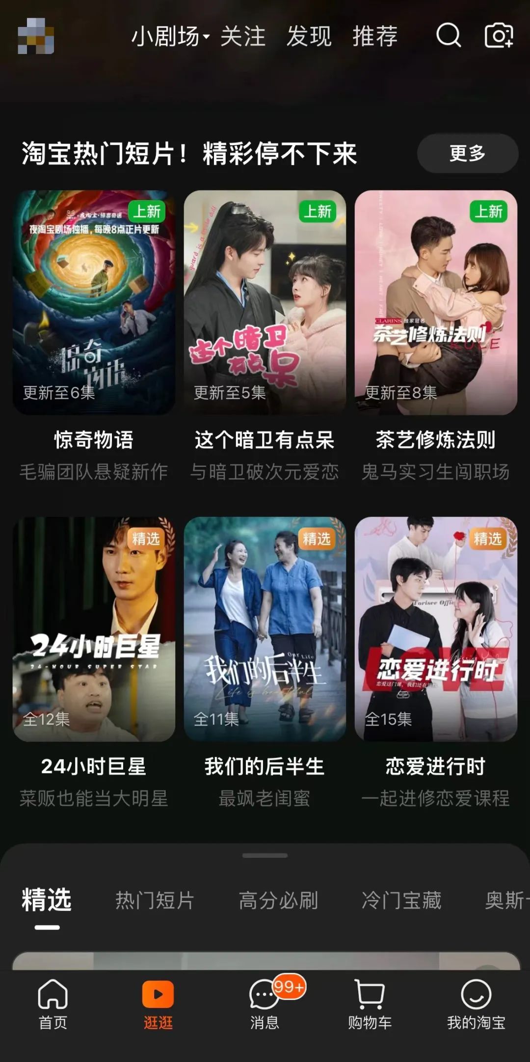 在内容供给上,部分平台也在引入短剧内容。在淘宝逛逛的“关注”子类目里面,有专门的“小剧场”栏目,里面有《惊奇物语》、《决战食物链》、《摊牌了我才是千金》等短剧集。