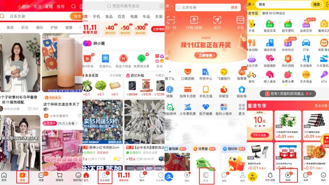 不久前,美团APP底部Tab栏中心位置出现了短视频入口,意味着美团全面布局视频内容的决心;支付宝在今年推出多个达人/MCN的扶持政策,以打造差异化的优质内容生态;淘宝也在今年加大投入推进内容化;拼多多在去年就将“多多视频”升级到首页一级入口。