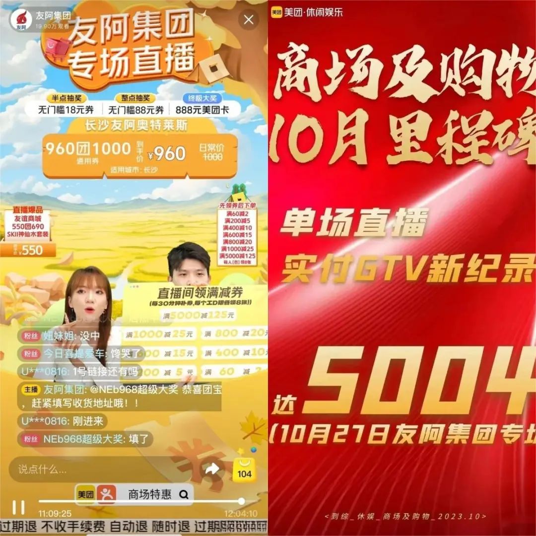 比如,10月27日,湖南友阿股份在美团进行了首场官方直播,上架商品包括旗下全国15家门店多种业态的全品类团购打折券,不到半天,卖出超过17300件商品,销售额达5004万元,创下美团单日直播的新高。