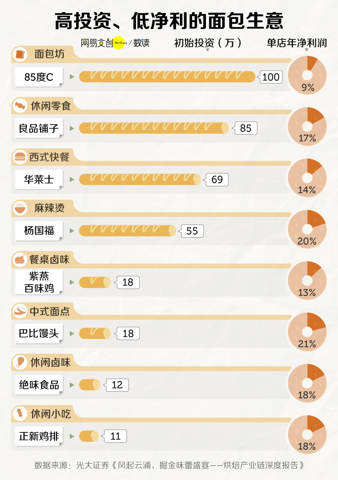 光大证券曾经做过一个连锁面包店与其他连锁休闲食品、轻餐饮的单店模型对比,面包店不仅启动资金最高,利润率还最低,回本时间也很长。