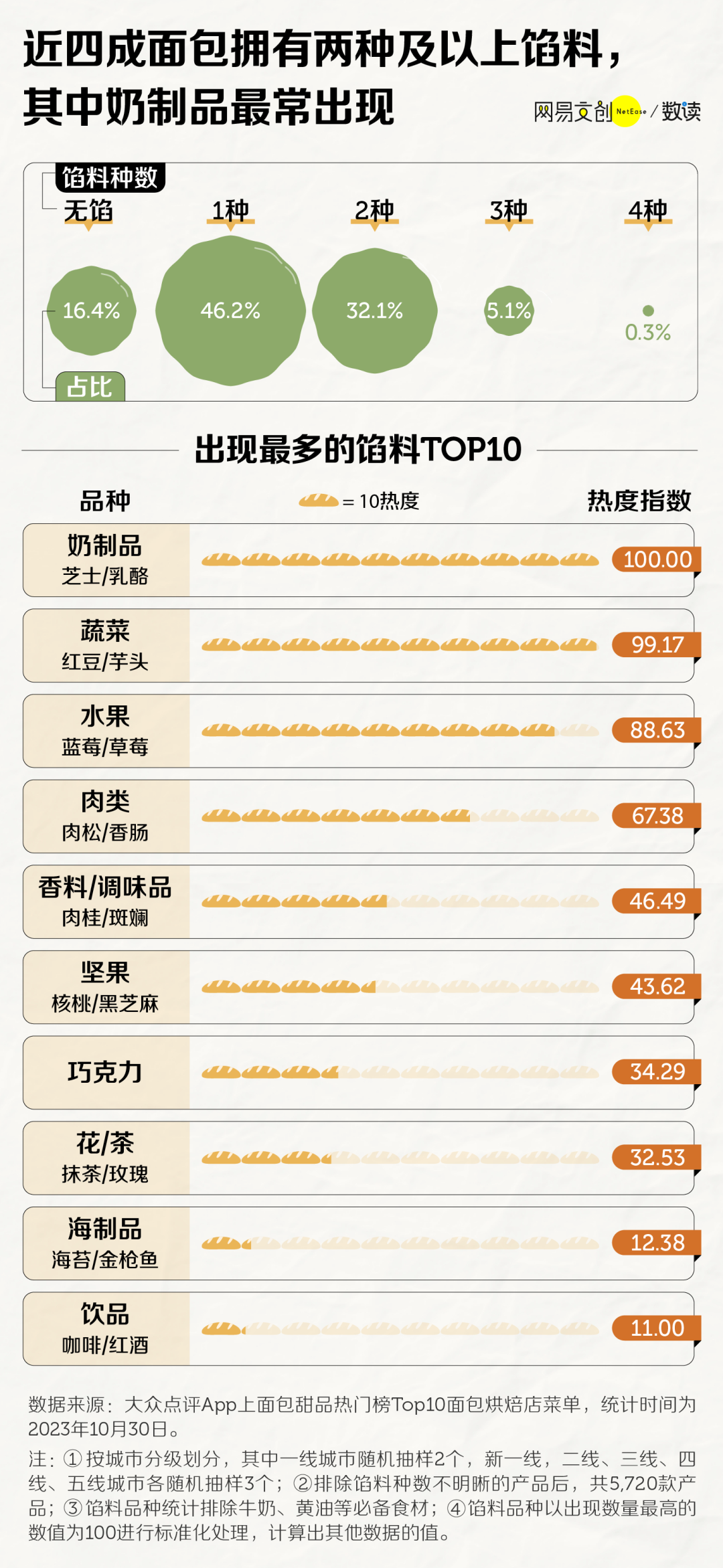 在我们统计的热门面包店产品中,近四成加了两种及以上的馅料。最常见的是芝士、乳酪等奶制品,和以红豆、芋泥、草莓为代表的蔬菜水果。