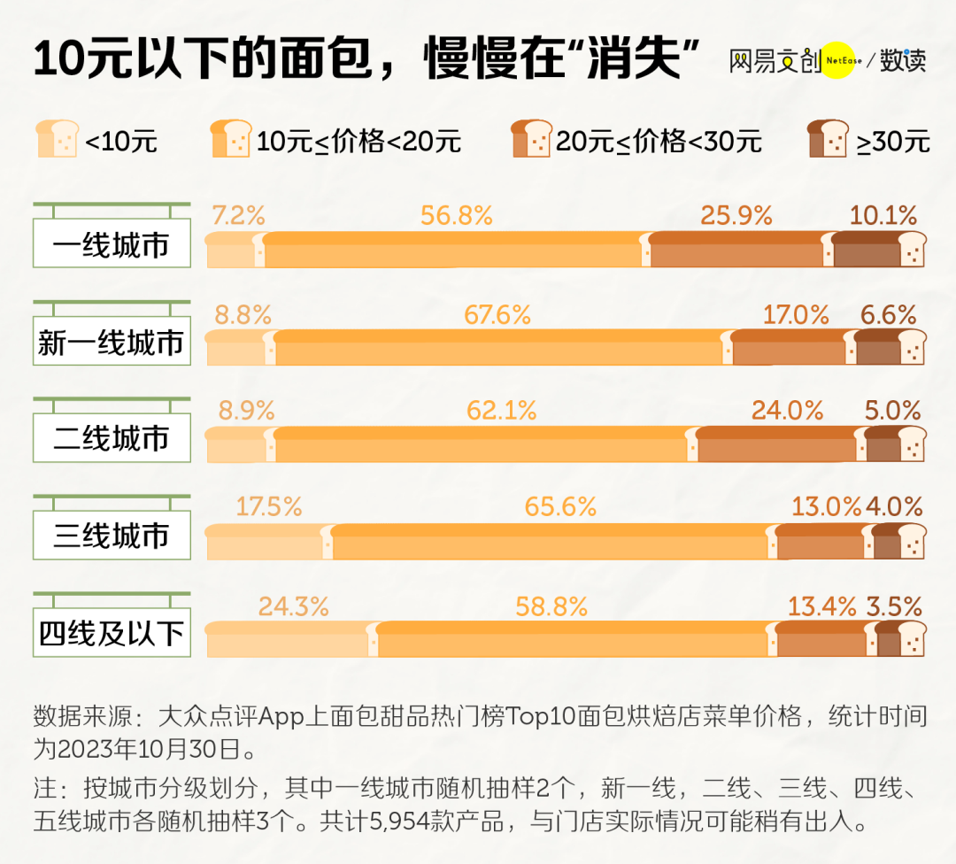 我们统计了大众点评上不同城市热门面包店的面包价格,结果发现大部分面包的价格集中在 10 元以上,即使是在四五线城市,也只有不到四分之一的面包低于 10 元。一线城市则更夸张,有将近四成的面包价格都超过了 20 元。