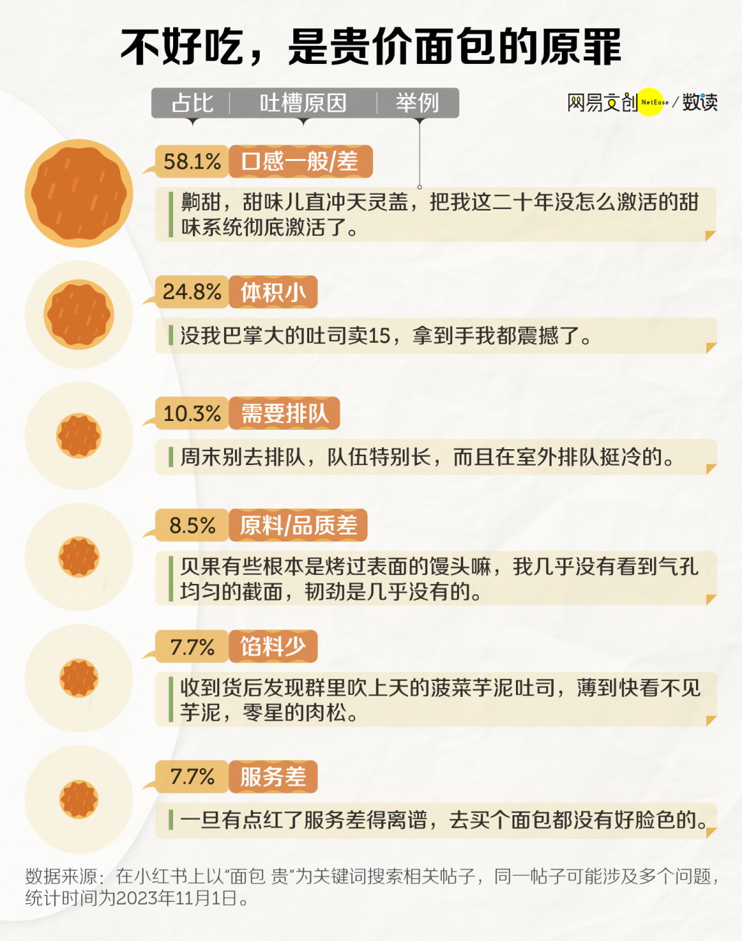 我们统计了小红书上与“面包贵”有关的笔记,其中最常见的吐槽就是价格与味道不成正比。明明花了大价钱,却被奇葩口味劝退,又或者尝起来平平无奇。
