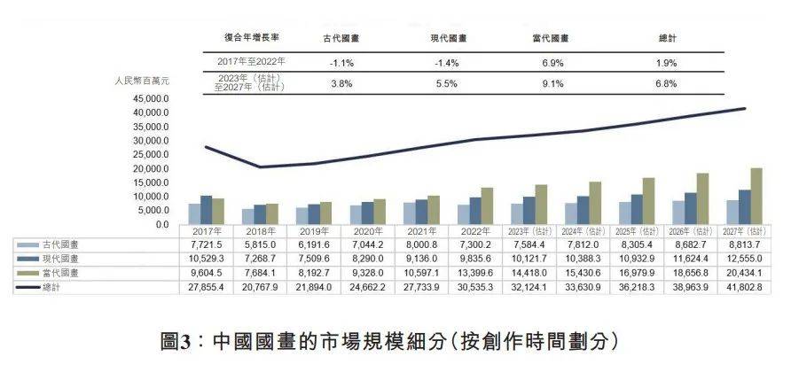 不过市场低迷并未持续太久,2019年国画市场便迎来复苏。根据弗若斯特沙利文披露的数据,2019年至2022年,国内国画交易额从218.94亿元增长至305.53亿元,年复合增长率为11.7%。