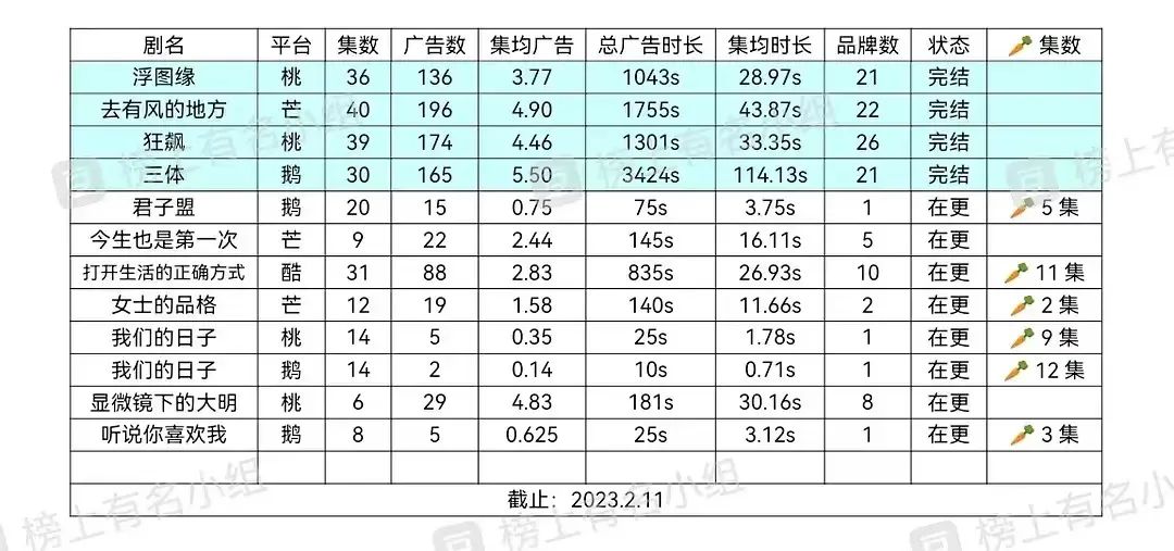 《有风》的网播广告数据相当亮眼,40集广告总时长1755s,总广告个数196,合作品牌高达22种,这是一个什么样的水平呢?