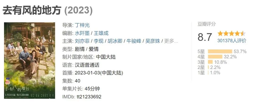 《去有风的地方》可以说是超越了此前田园剧的短板——主演刘亦菲、李现自带流量讨论度,同时也跳脱出男女主“换个地方谈恋爱”的情节局限。