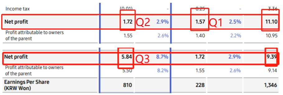 这不是三星电子本年度净利润下滑最为严重的一个季度,今年第一,第二季度,三星电子的净利润下滑程度更为严重。其中,第二季度三星电子净利润1.72万亿韩元,较上年同比下滑84.50%;第一季度,三星电子净利润1.57万亿韩元,较上一年同期同比下滑86.13%。