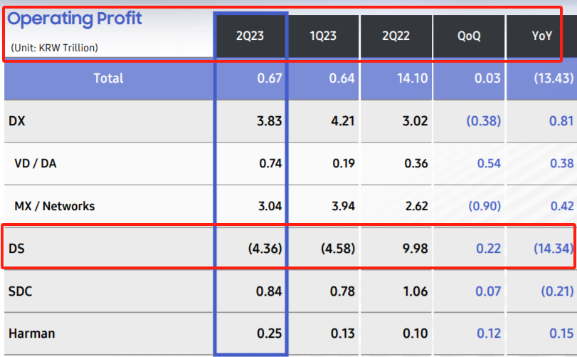 净利润大幅下滑的背后,半导体业务的连续亏损,成为公司本年度亏损最为严重的业务单元。前三季度,三星电子处理半导体的设备解决方案(DS)业务分别亏损4.85万亿韩元、4.36万亿韩元和3.75万亿韩元,累计亏损12.96万亿韩元,折合人民币714.52亿元。
