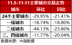从上周(11月5日-11月11日)数据看,24城整体成交量环比下降29.95%,一线、二线、三四线城市均呈下滑趋势,其中,二线城市降幅最大,达44.13%。