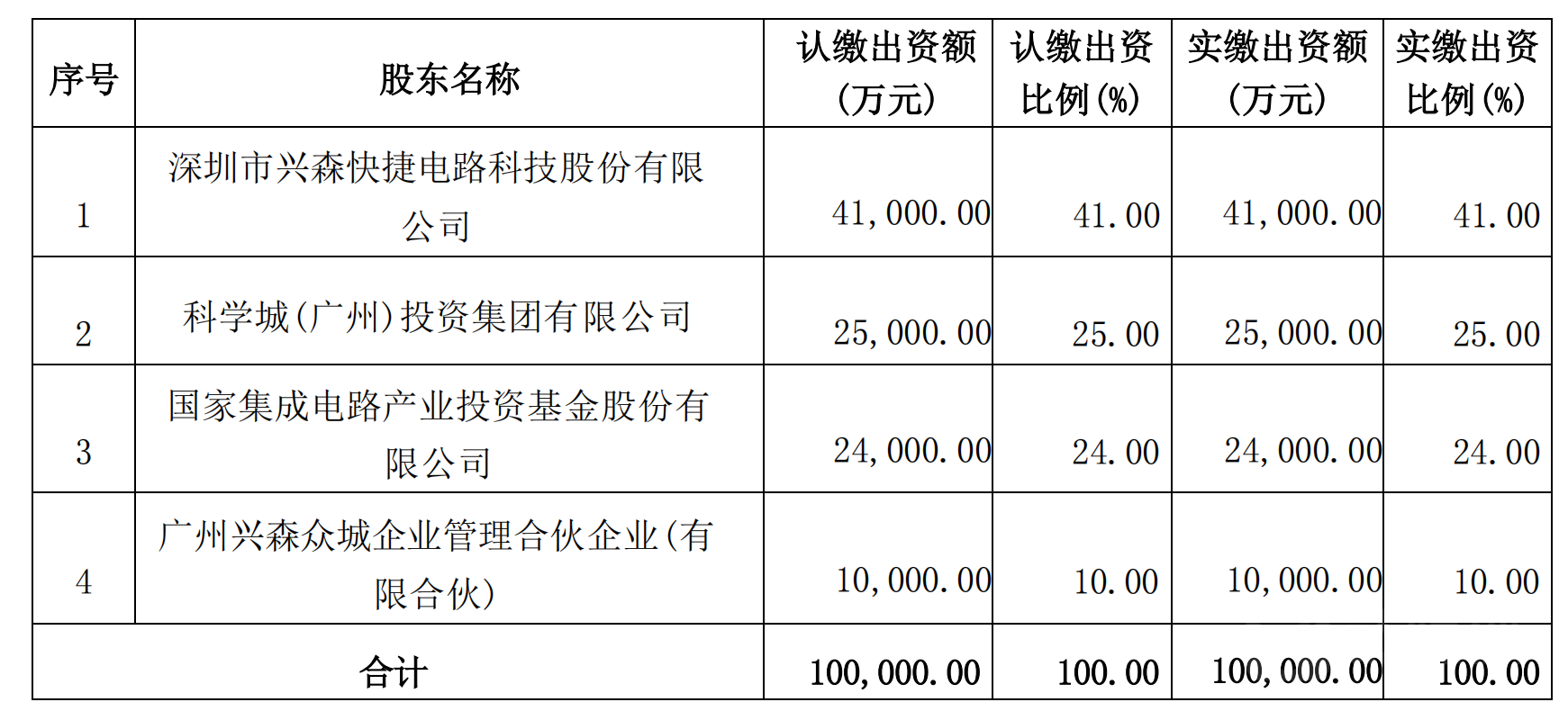 根据此前公告,广州兴科计划总投资金额16亿元,首期注册资本10亿元,由各股东以货币方式出资。其中,国家大基金认缴出资额为2.4亿元,占注册资本的24%,兴森科技认缴出资4.1亿元,持股比例41%;科学城认缴出资2.5亿元,持股比例25%,兴森众城认缴出资1亿元,持股比例10%。