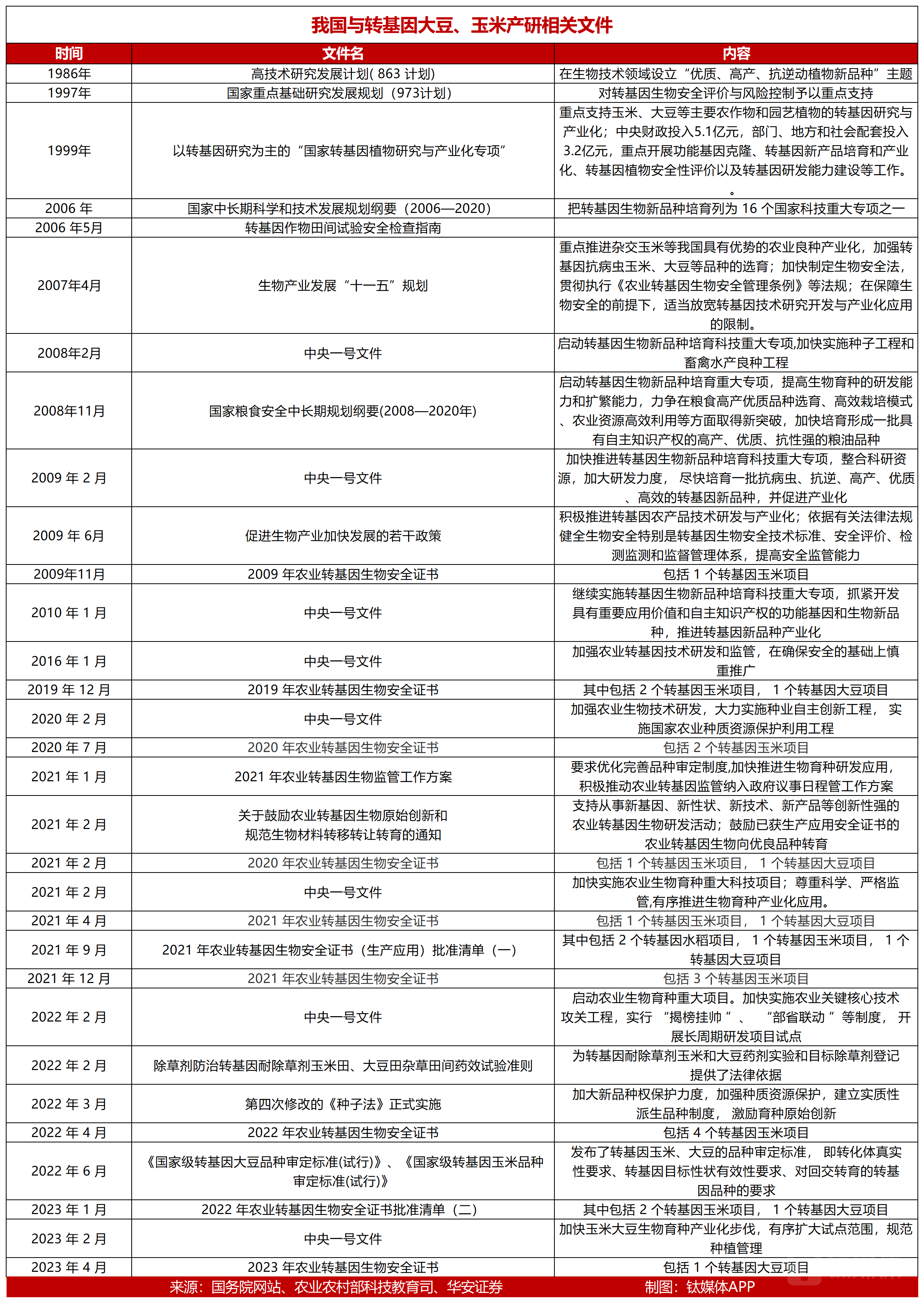 玉米、大豆作为饲料作物、油料作物,对养殖、食品行业影响重大,因此备受重视。据不完全统计,在过去三十多年中,政府推出的大豆、玉米相关的转基因文件超过30份。