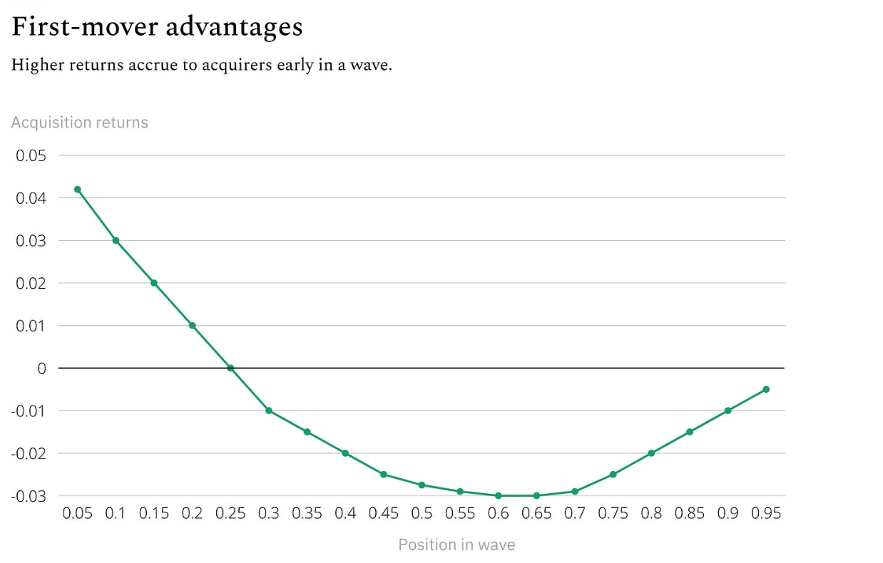 通过研究20年期间的3194笔并购,研究人员发现了一种有趣的关系:在浪潮早期采取行动的买家更容易成功。