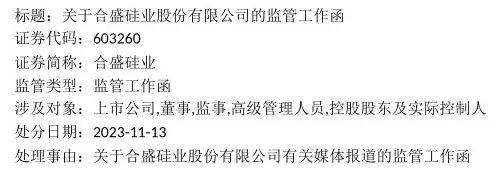 该事件迅速引起了监管层关注,11月13日,上交所对合盛硅业下发了监管工作函,涉及对象包含上市公司、合盛硅业实际控制人以及公司高管。