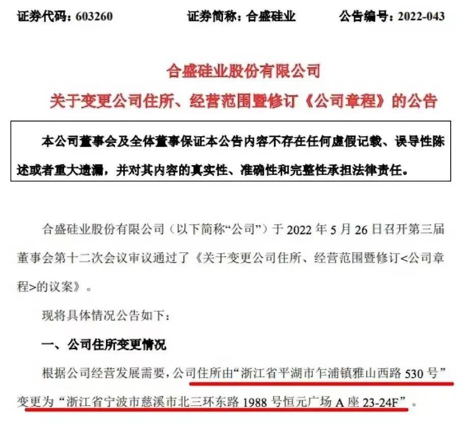 2022年5月28日,合盛硅业公告称公司向股东大会提交议案,公司住所将由浙江省平湖市搬迁至浙江省宁波市(编者按:平湖市隶属于浙江省嘉兴市)。