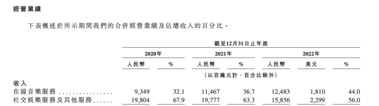 此前,腾讯音乐一直被质疑到底是音乐公司还是直播公司。2022年以前,腾讯音乐的社交娱乐服务及其他服务的收入均高于在线音乐收入。2019年腾讯音乐的社交娱乐服务及其他服务的收入贡献了总收入的71.9%。