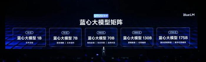 11月vivo发布的自研AI大模型矩阵,其中包括十亿、百亿、千亿三个不同参数量级的5款大模型。其中,10亿量级模型是主要面向端侧场景打造的专业文本大模型,70亿模型是面向手机打造的端云两用模型,700亿模型是面向云端服务的主力模型。