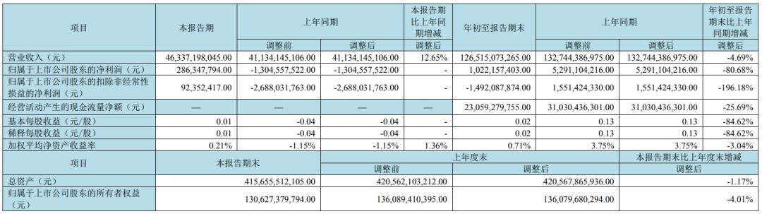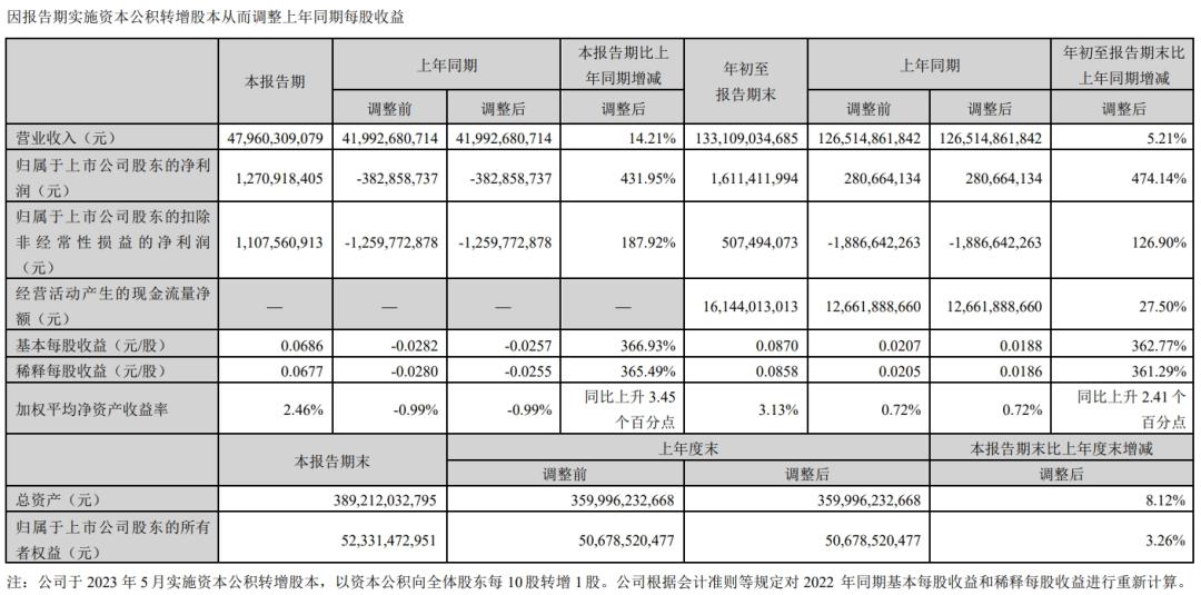 其中,公司第三季度营收479.6亿元,同比增长14.21%;实现归属于上市公司股东的净利润12.71亿元,去年同期则为亏损3.83亿元。