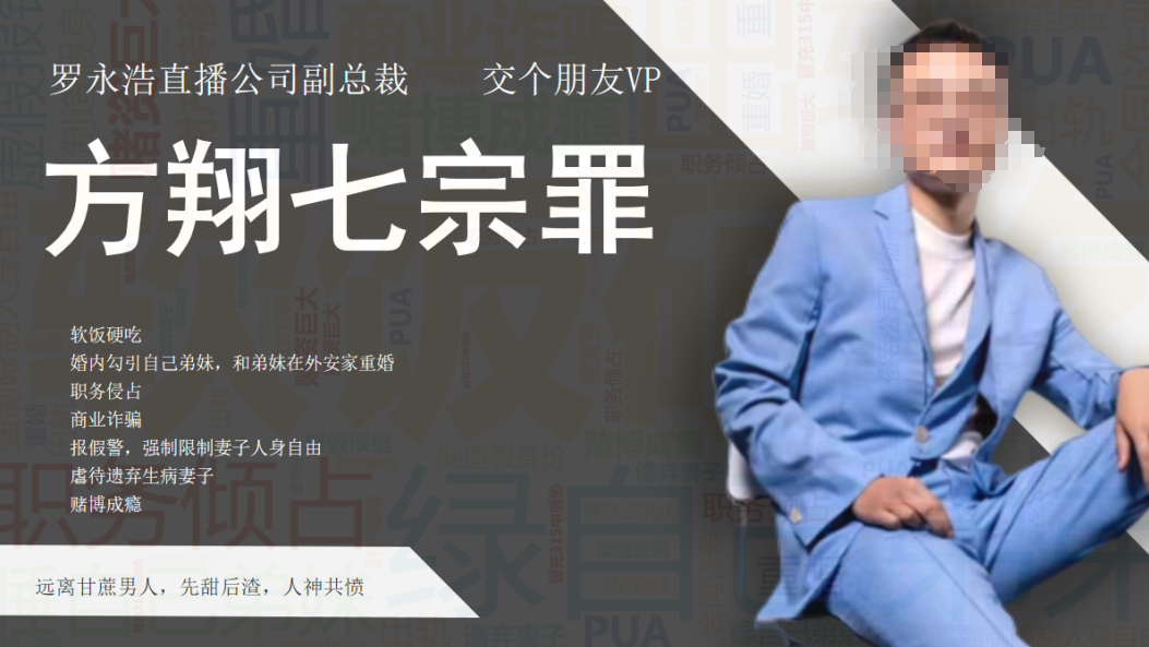 除了感情方面的指控,作者还罗列了方翔在工作方面的多项“罪状”。比如,方翔在交个朋友担任VP期间,利用职务之便让自己的亲友和下属在外成立公司做交个朋友直播业务的合作,并将交个朋友的业务切到自己在外的公司收取更大的个人利益,方翔还利用职务之便在交个朋友内部帮助亲友公司推进业务、介绍关系。