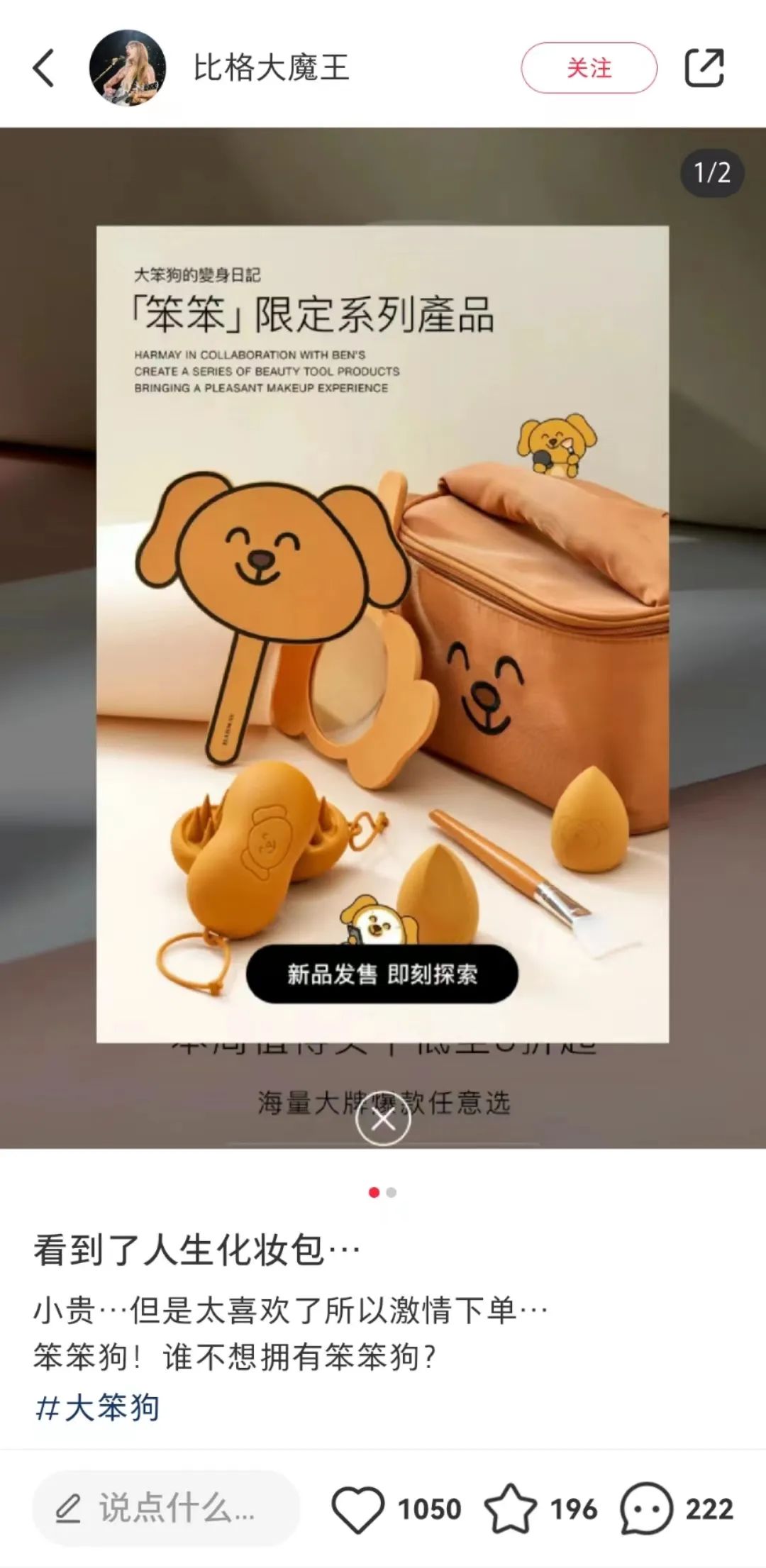 购买喜茶附赠的大笨狗贴纸成为了大受追捧的时尚单品,喝上奶茶的小狗出现在了「笨友」的电子产品和家具上。今年9月大笨狗与化妆品牌HARMAY联合推出了化妆镜与化妆包,定价不到70元,不少粉丝选择批量购入。