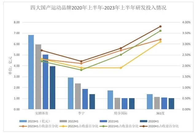 这或许和近几年李宁资源倾向营销而非研发有关。2023年上半年,李宁广告及市场推广开支为10.42亿元,同比增长6.22%,占总营收的7.4%,研发费用则相对有限,上半年仅为2.91亿元,仅占总营收的2.1%。