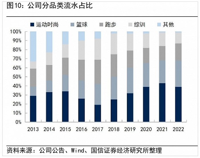 但是,2022年情况逆转,运动时尚品类占比下滑,篮球及跑步品类占比上升,更确切的数据是鞋类在总营收中的占比达到52.24%,服饰则下降至41.5%。