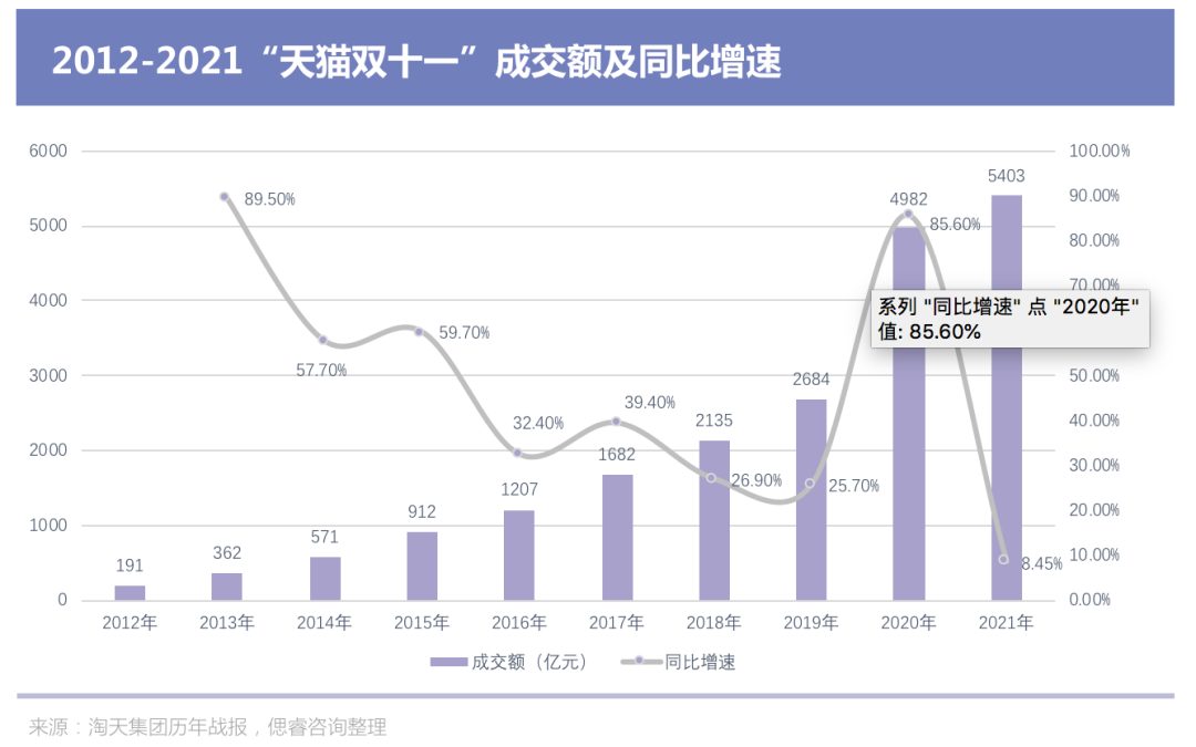 (图:2012-2021“天猫双十一”成交额及同比增速 来源:淘天集团历年战报)