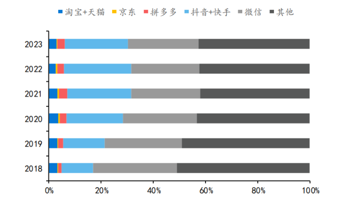 而抖音则是基于兴趣电商打磨出的算法分发体系,重点驾驭对平台信息依赖程度更高的“非高价、非标品”,如服饰、美妆。根据Questmobile的数据,抖音+快手的用户使用时长占比从2020年的21.32%提升至2023年的24.28%,淘宝及天猫的用户时长占比则从3.62%降低至2.77%。可以推断,直播电商平台沉浸式带货种草的属性,天然适合强展示品类的销售,用户停留时间长,下单的可能性上升。因此抖音等兴趣电商平台,对服饰、美妆占比较高的淘天冲击较大。