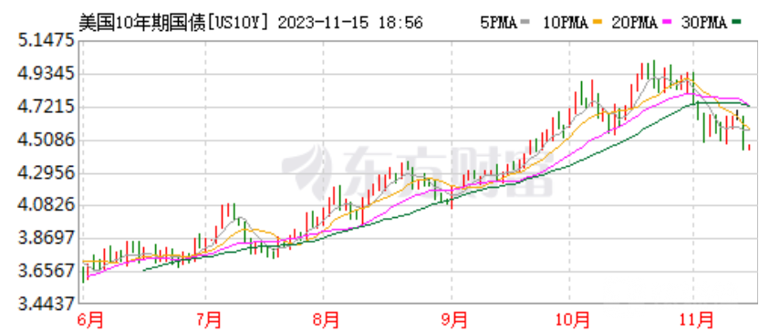 瑞银投资银行策略师预测,如若美国通胀持续下降,将能够让美联储最早在明年3月开始放松政策,利率可能以宽松周期内典型的大幅步伐下降。美国10年国债收益率自10月底以来持续下跌,这也印证了美联储主席鲍威尔在会上暗示的加息周期可能接近尾声,叠加本次通胀放缓,市场乐观情绪进一步增强。