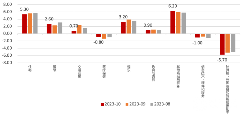核心商品价格同比除服装、医疗保健、其他商品和服务外,其余均呈回落状态。住房通胀指数自近年来持续回落,但核心通胀粘较强,同比4%的水平依旧远高于目标通胀。总体来说,10月通胀数据是一份令人较满意的数据,这意味着12月份第8次议息会议加息可能性下降。