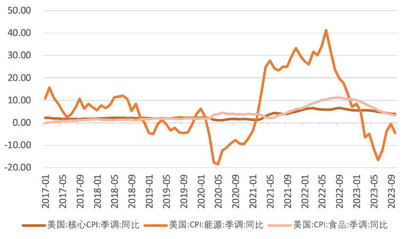 拆分能源和食品项,10月食品价格环比升0.3%,同比上升3.3%;能源价格环比下降2.5%,同比下降4.5%,通胀回落,能源价格贡献显著。在对巴以冲突将破坏中东供应的担忧钝化的背景下,全球主要经济体经济数据表现均不佳,未来石油需求景气度令供应商的担忧。此外,10月美国原油产量创下1320万桶/日的历史新高,出口量也达到2015年解除出口禁令以来的最高水平,与此同时美国还打压油价,预计近期能源通胀压力将继续缓解。